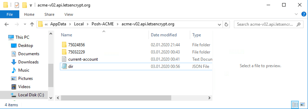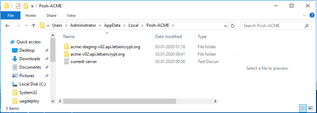 After successful request and every renewal the Posh-ACME script will save all the variables of certificates and keys in the folder structure of the user that was executing the scripts C:\Users\Administrator\AppData\Local\Posh-ACME