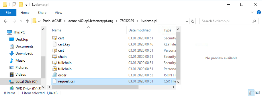 Lastly, all the certificates, keys, chains and csr’s are in the domain folder. Default password for the PFX file is poshacme – it can be also found in the order.json file along with other certificate parameters.